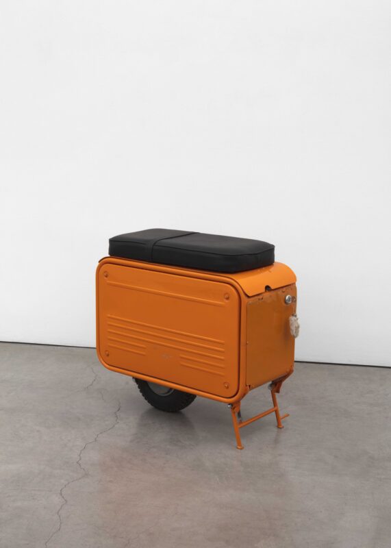 Robert Grosvenor, untitled, 2020, Valmobile scooter circa 1961 with Nason acrylic enamel paint, rabbit’s foot keychain, key, 27 1/2 x 24 1/2 x 14 in. (69.9 x 62.2 x 35.6 cm)